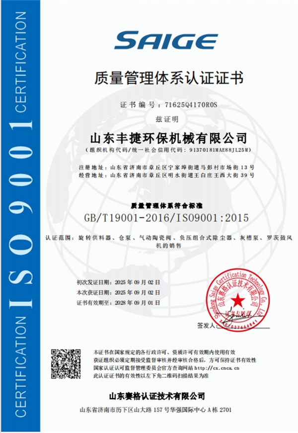 山東豐捷環保機械有限公司,是一家專注于氣力輸送系統研發、設計、制造、安裝及運維的企業。自成立以來,公司始終以“高效輸送,賦能工業”為使命,為建材、化工、電力、糧食、環保等多領域客戶,提供定制化的粉粒體物料輸送整體解決方案。